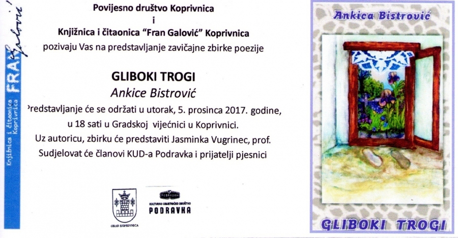 Dana, 05. prosinca 2017. godine s početkom u 18,00 sati u Gradskoj vijećnici Koprivnica, održat će se predstavljanje zavičajne zbirke poezije "Gliboki trogi", autorice Ankice Bistrović. Uz autoricu, zbirku će predstaviti Jasminka Vugrinec, prof., a poeziju promovirane zbirke će kazivati članovi Literarne sekcije KUD-a Podravka i autoričini prijatelji pjesnici. U glazbenom dijelu programa, svojim nastupom će promociju uveličati Ženski vokalni sastav KUD-a Podravka. Zbirka je sufinancirana od strane KUD-a Podravka u 2017. godini.